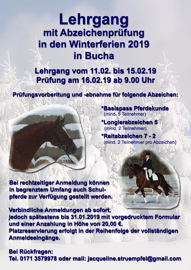Freitag, 27. Dezember 2019 - Samstag, 4. Januar 2020Reitabzeichenlehrgang in Mühlberg Reitanlage Schack in Mühlberg