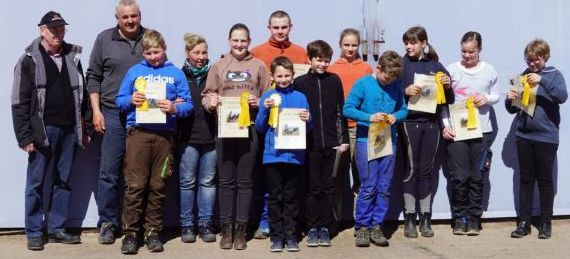 Der Zeitplan stand bei Zeiten und mit 11 Teilnehmern (E. Schumann, M. Jünemann, A. Schlewinski, K. Hruschka, S. Arendt, N. Höring, L. Hohmann, C. Weber, A. Leopold, S. Piepew, L. Hebs) aus der „Gruppe -Goldene Schärpe“ startete am Samstag, den 28.04.2018 das Training zur Vorbereitung auf den Bundeswettkampf. Auf der Anlage von Heinz Bley, der großzügig Boxen für die Vierbeiner zur Nutzung überließ, konnte unter günstigen Bedingungen sowohl Dressur, Springen, Mustern, Theorie und natürlich Gelände geübt werden.
